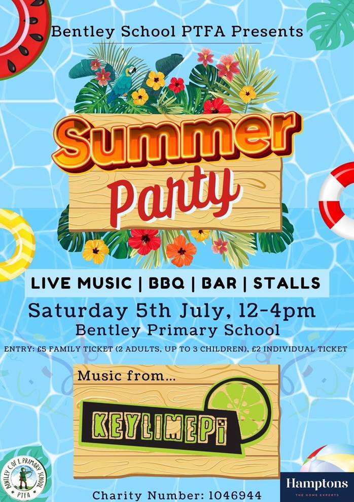 Summer Party, Saturday 5th July, 12-4pm. Add this date to your diaries for a fun, music filled afternoon! With music from Key Lime Pi - a 9 piece band performing at Bentley School! A BBQ, bar, inflatables and stalls will be available all afternoon.