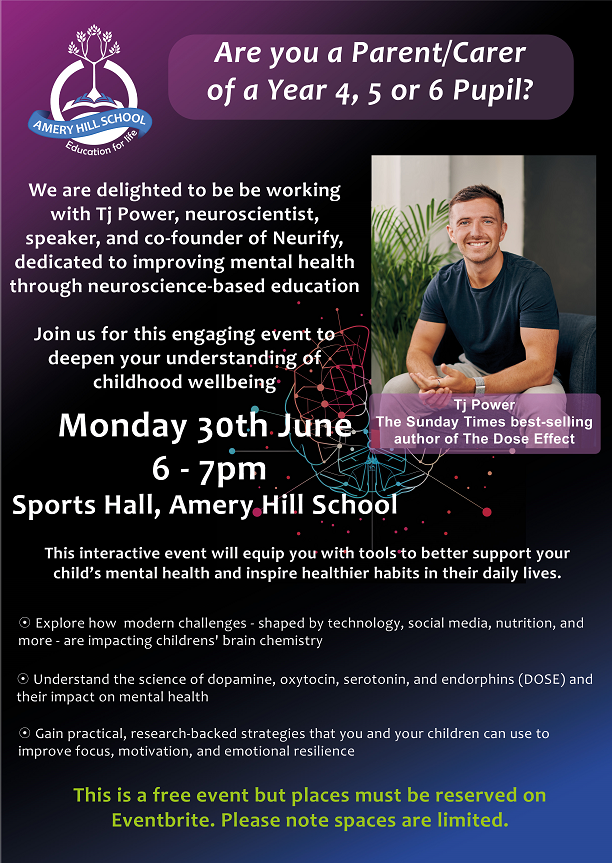 Looking ahead, parents have been invited to attend a special talk at Amery Hill on 30th June, given by TJ Power. TJ is a neuroscientist, mental health and wellbeing speaker, and founder of The Empowering Minds Institute. He specialises in helping people understand the brain and how to support mental wellbeing in a practical and empowering way. I would highly recommend coming along to hear him speak—he is incredibly informative and always leaves you with lots to think about. A letter was sent out earlier this week to show how to book, please contact the office if you need assistance.