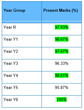 Governors have set the attendance target for the school at 97%. Last week the overall attendance rate for the whole school was 90.75%. The class with the best attendance was Year 6, with 100% attendance. Well done year 6!