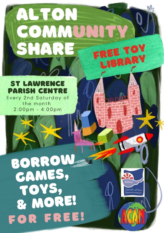 Alton Community Share – this SaturdayAlton Community Share is a free library of jigsaws, games, toys and activities, powered by the generosity of our community. Currently run every two weeks in St Lawrence’s Parish Centre, it helps people of all ages to banish boredom while saving money and supporting sustainable living by re-using preloved stuff – which reduces waste and carbon emissions.