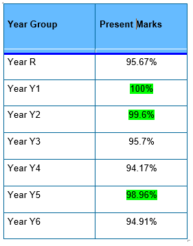 The Government sets a standard of 95% attendance for primary schools. Our Governors have set a school target of 97%. Achieving an attendance rate of 95% means that your child would have had approximately ten days of absence throughout the year.