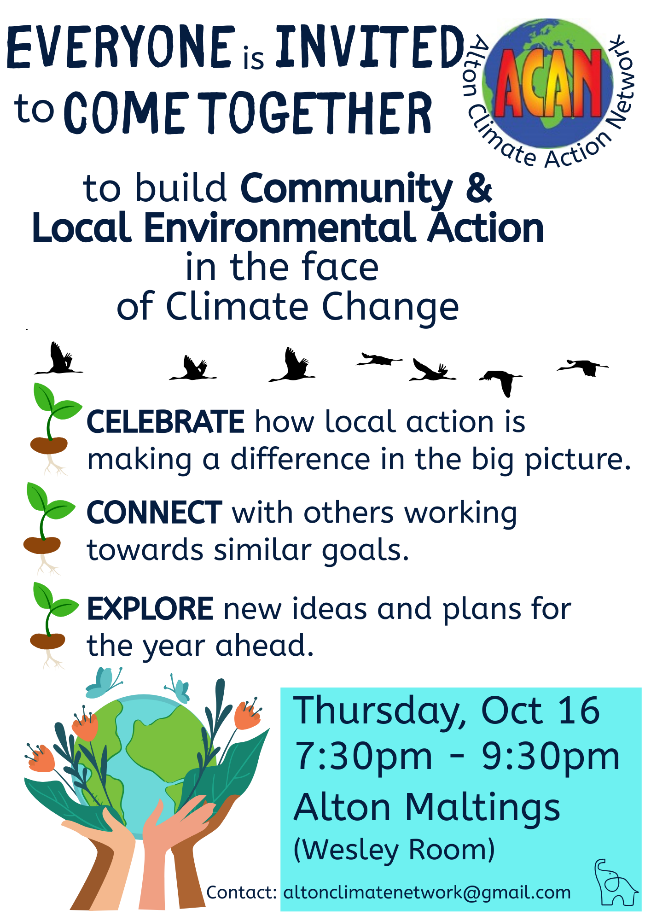 Bentley is proud to be a member of the Young ACAN Schools’ Partnership, working with all our local schools to provide climate education to our children. Young ACAN is part of ACAN, a charity which oversees a range of groups such as the Repair Café, Community Cupboard and Community Share. On Thursday 16th October there will be an open meeting to enable participants to find out more and get involved. If you are keen to get involved in positive action for our planet with like-minded people, do come along! See poster for details.