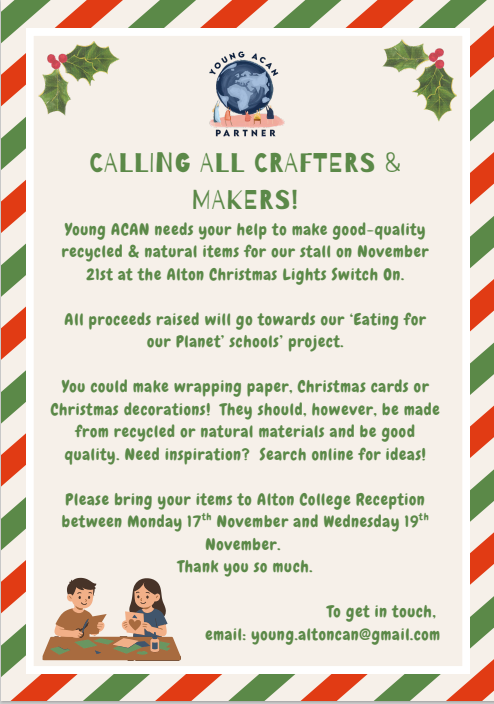 Young ACAN is asking for your help! On Friday 21st November Young ACAN will host a stall at the Alton Christmas Lights Switch On.  The aim is to raise funds through donations for some GOOD QUALITY recycled/natural Christmas crafts - wrapping paper, cards and decorations.  This is an ideal half-term activity that families can get involved in.  The items need to be good quality - we don't want to be left with a box of things that people don't want! There are lots of great ideas online. Alton College will be the collection point for the Christmas Crafts.  Please bring your items into school by Wednesday 19th November and Madame Jones will collect them. Thank you so much!