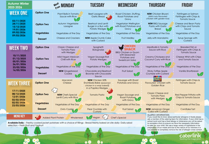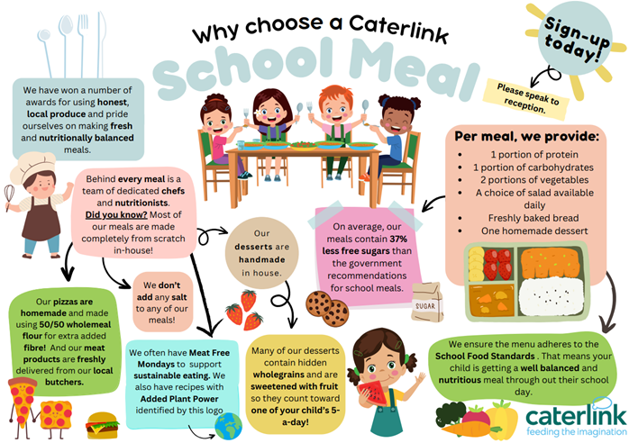 We have received lots of positive feedback regarding our new school meals offering, but there have been a couple of changes to the menus for after half term in response to some constructive comments made. Please see the updated menus below, and a reminder of the great benefits of choosing a Caterlink school meal for your child.