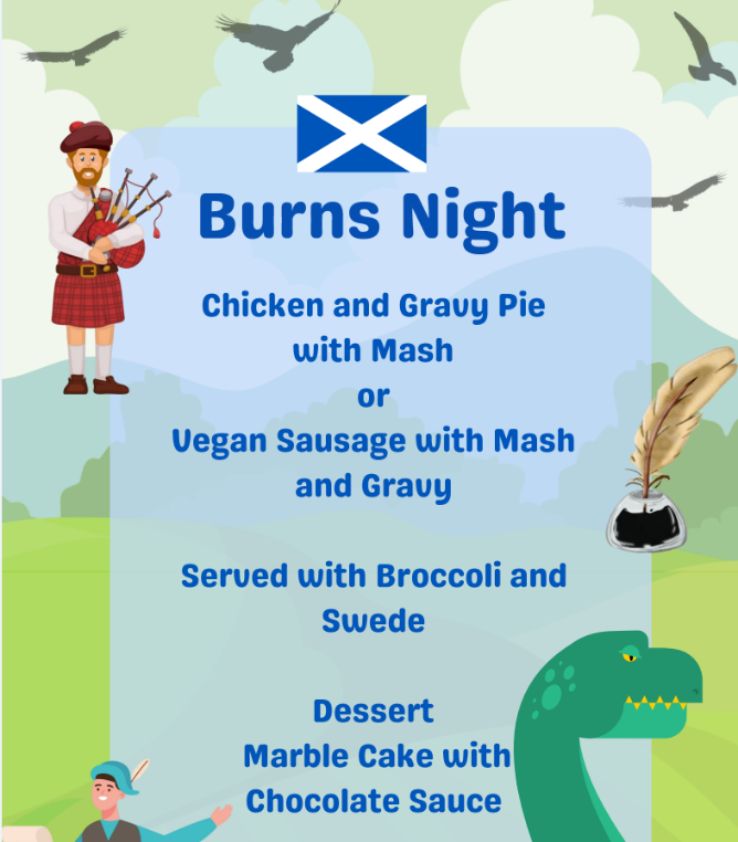 To celebrate Burns Night there will be a menu change on Monday 16th January. The Red option will be chicken with gravy pie, and Green will be vegan sausage and gravy. Both options will be served with mashed potatoes, with marble cake and chocolate sauce for dessert.