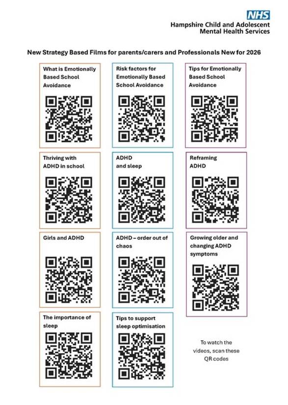 Hampshire CAMHS have released new short films — scan the QR code to learn more about strategies to support ADHD, sleep, and emotionally based school avoidance. Useful for parents/carers and professionals.