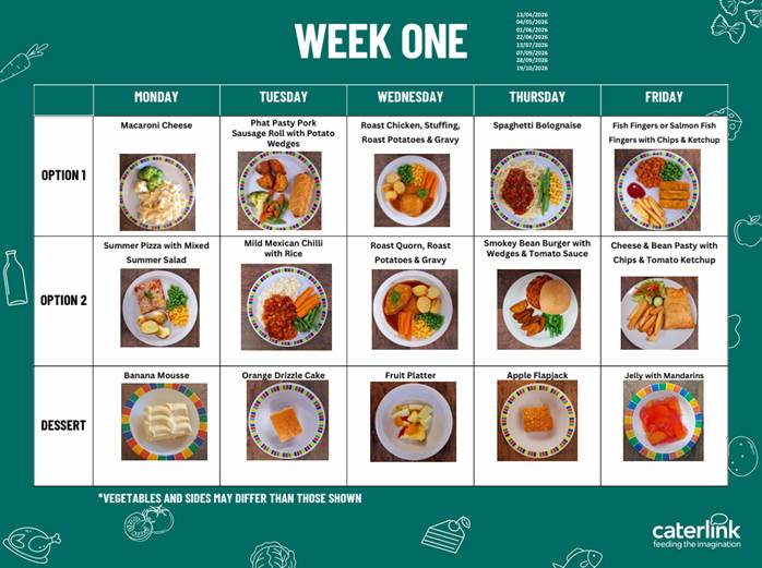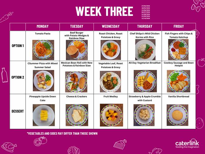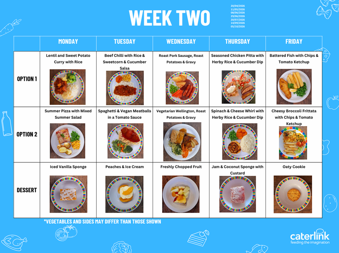 The new menu will launch at the start of the summer term with Week 1. We are excited to announce that as well as the options available on the menu each day, we will also continue to offer a jacket potato option with tuna, cheese or beans, as well as a new picnic lunch option for the summer term. There will be lots to choose from each day and we hope that a lot of our children choose to have a school lunch.